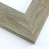 This simple frame is covered with a matte grey wash that highlights the natural wood grain.  An antique look is created with a gold patina.